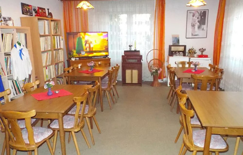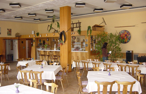 Das "Haus am Walde" verfügt im Erdgeschoss (EG) über einen großen Saal mit Bar, in welchem auch Gruppen von bis zu 120 Personen Platz finden. Entsprechend viele Tische und Stühle sind vorhanden.