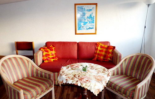 große Wohn- und Schlafebene mit 4 Betten (ein Doppelbett & 2 Einzelbetten), Couch & 2 Sesseln, einem Couchtisch,