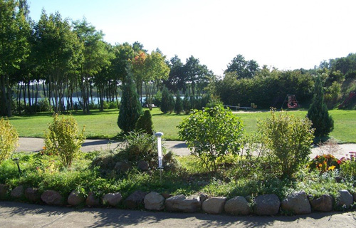 Der daran anschließende lichtdurchflutete Wohnraum hat ein großes Panoramafenster mit Schiebetür, ebenfalls Südseite und Seeblick. Im Wohnraum befindet sich ein Esstisch mit 5 Stühlen, Couch mit Glastisch, Radio, 45-Zoll-LED-Fernseher und eine Einbauküche. Die Einbauküche besteht aus Kühl-Gefrierkombination, Spüle, 4-Plattenherd, Backofen, Wasserkocher, Toaster, Kaffeemaschine, Geschirr und allen Kochutensilien. Die großzügig angelegten Außenanlagen stehen allen unseren Gästen zur Verfügung. Ein Holzkohlegrill kann benutzt werden.