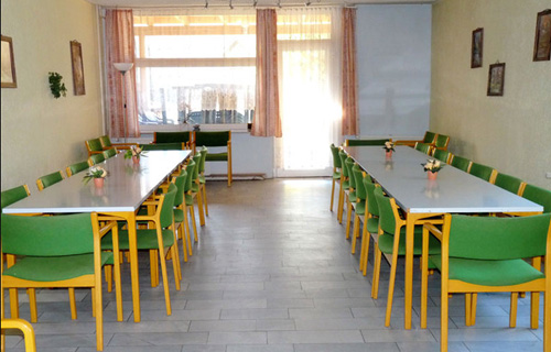 Im Erdgeschoß befinden sich 2 Aufenthalts-/Gruppenräume, die je nach Größe der Gruppe von der jeweiligen genutzt werden kann. Zusätzlich steht den Gästen im Erdgeschoss (EG) eine Gemeinschaftstoilette mit 3 WCs und 2 Waschtischen zur Verfügung.