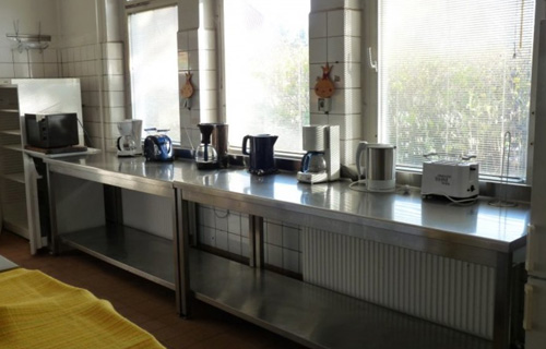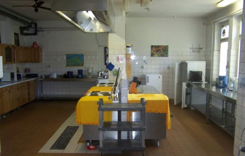 Der große Gruppenraum (Saal), mit seinen 50 Stühlen und entsprechend vielen Tischen hat außerdem eine Musik- & TV-Ecke mit einem 75-Zoll LED-TV und Tanzfläche. Daran schließt sich die vollumfänglich ausgestattete Großküche an, mit der man auch eine Gruppe von bis zu 60 Personen bekochen kann.