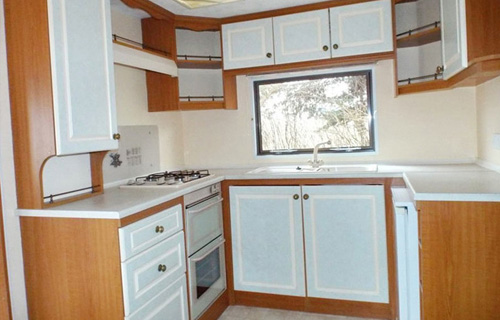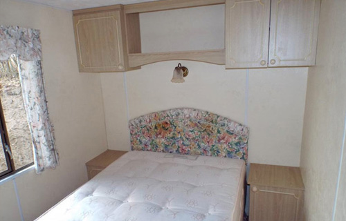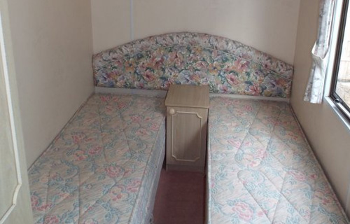 Vom Garten und der überdachten Terrasse betritt man den Flur des Mobilheims. Zur Linken befindet sich das Gästeschlafzimmer mit 2 Betten (1,90 x 0,70 m), Kleiderschrank und Nachttisch, zur Rechten vorn das Kinderschlafzimmer mit 2 Betten ja (1,90 x 0,70 m), hinten zur Rechten das Elternschlafzimmer mit französischem Doppelbett (1,40 x 2,00 m), Kleiderschrank, Nachtschränken.